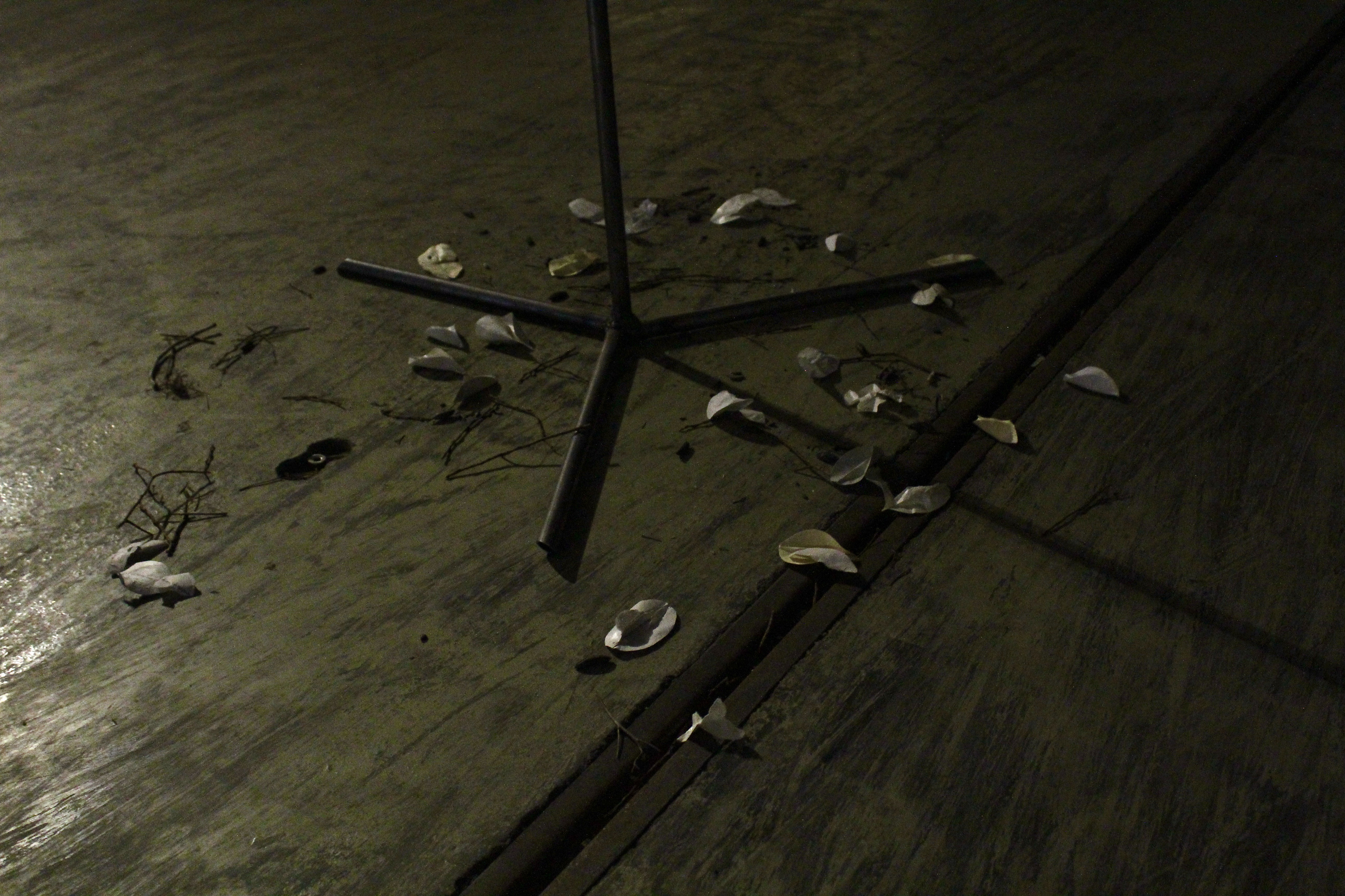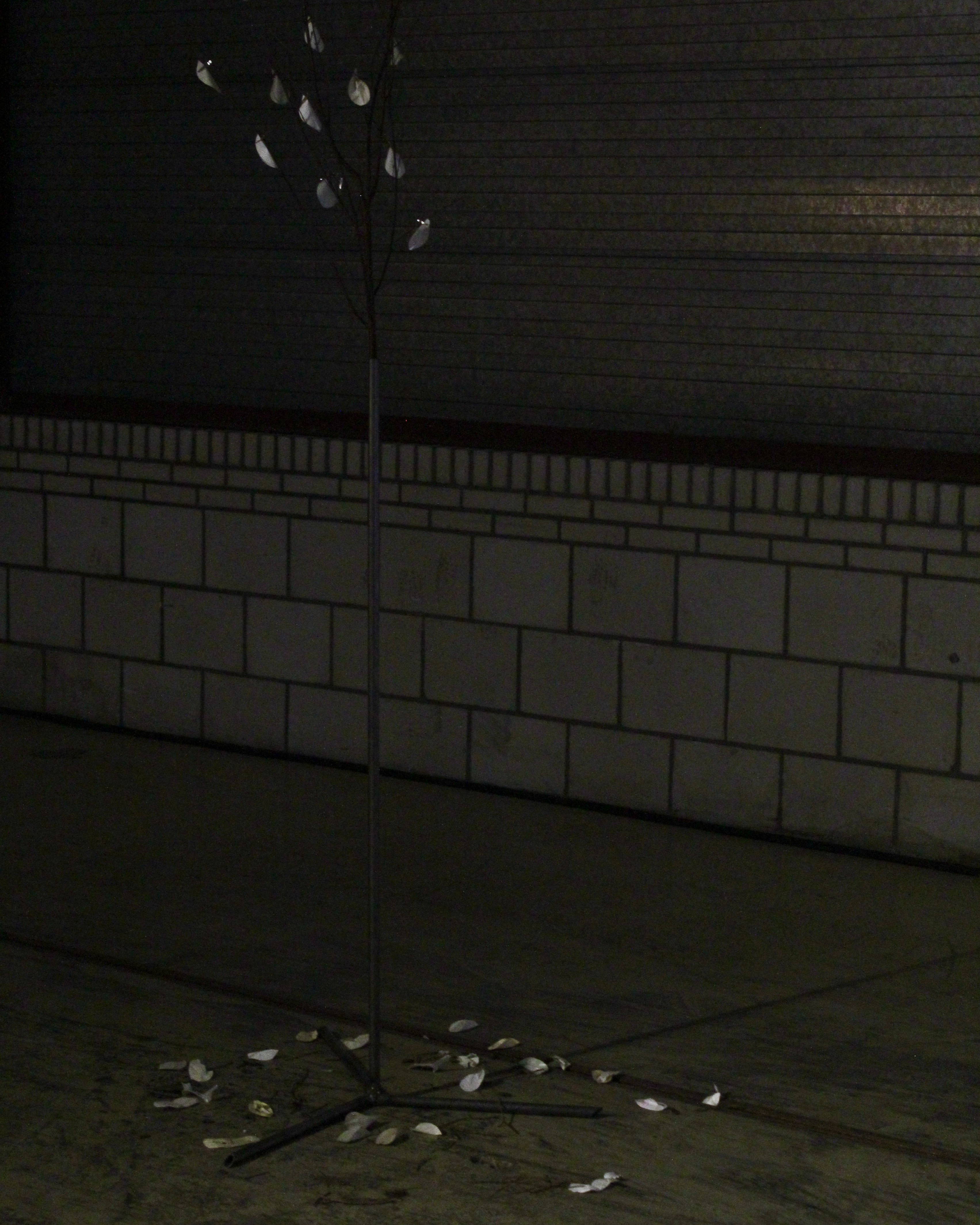 paper, inkjet print, ebonized date and apple seeds, a found branch, steel.