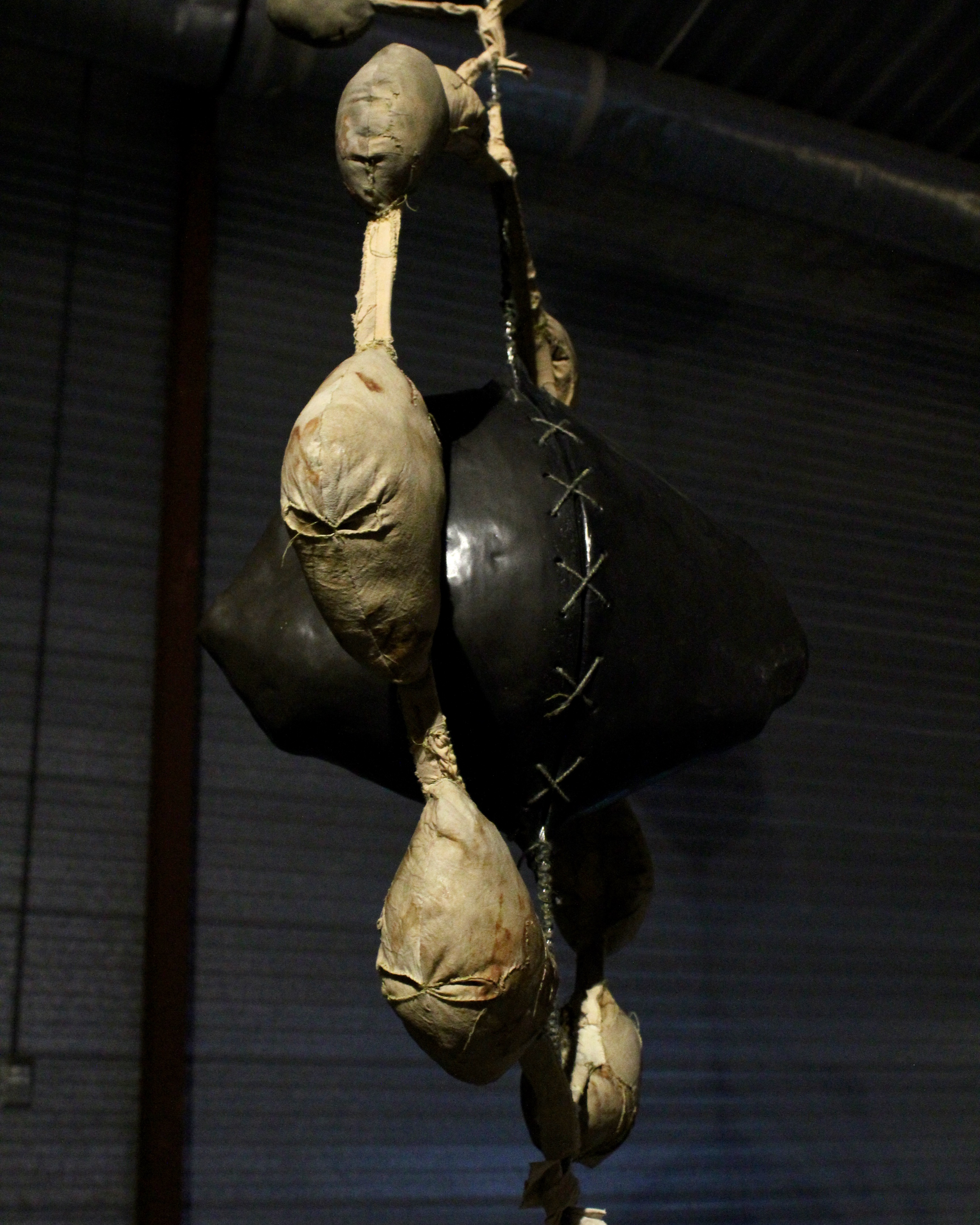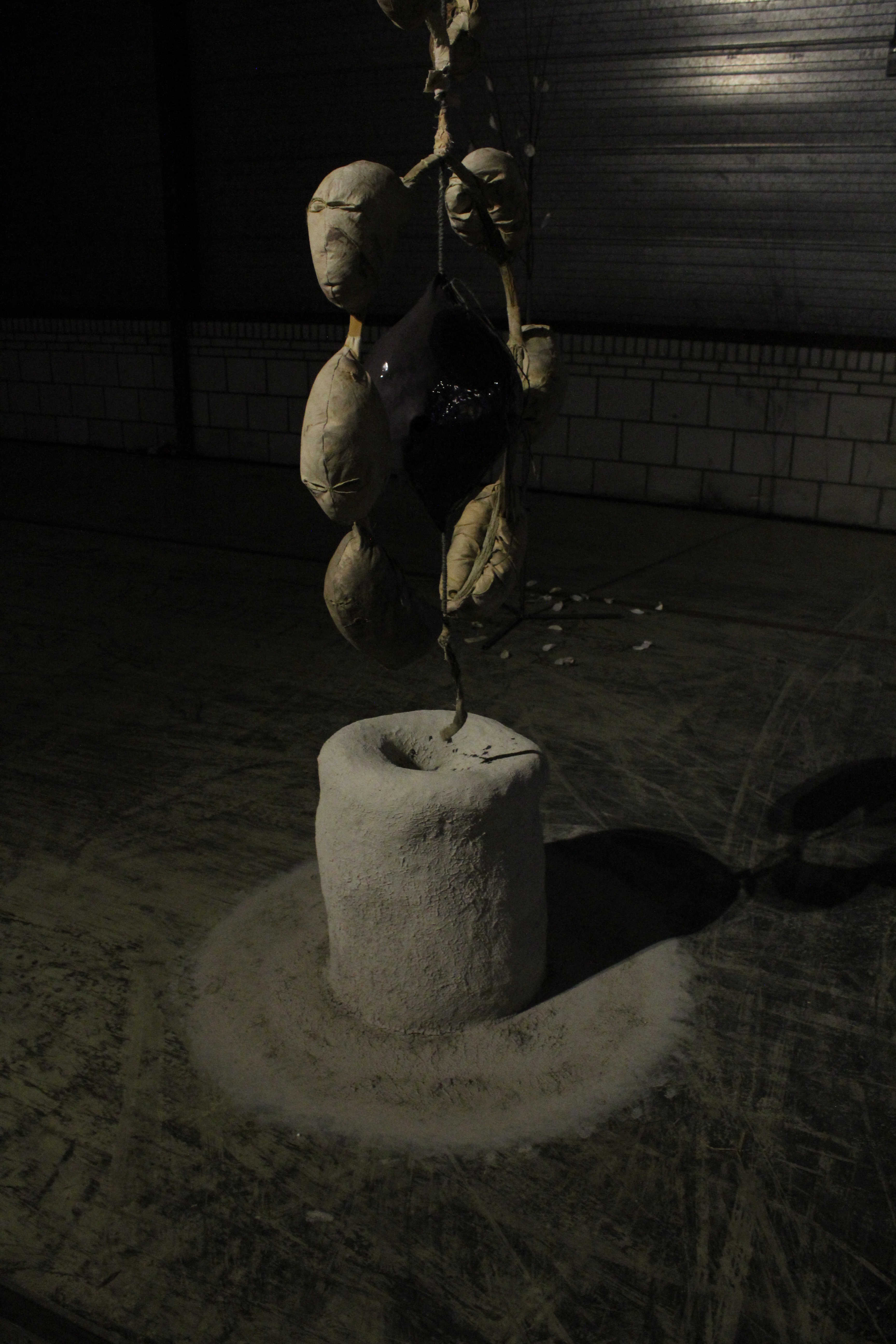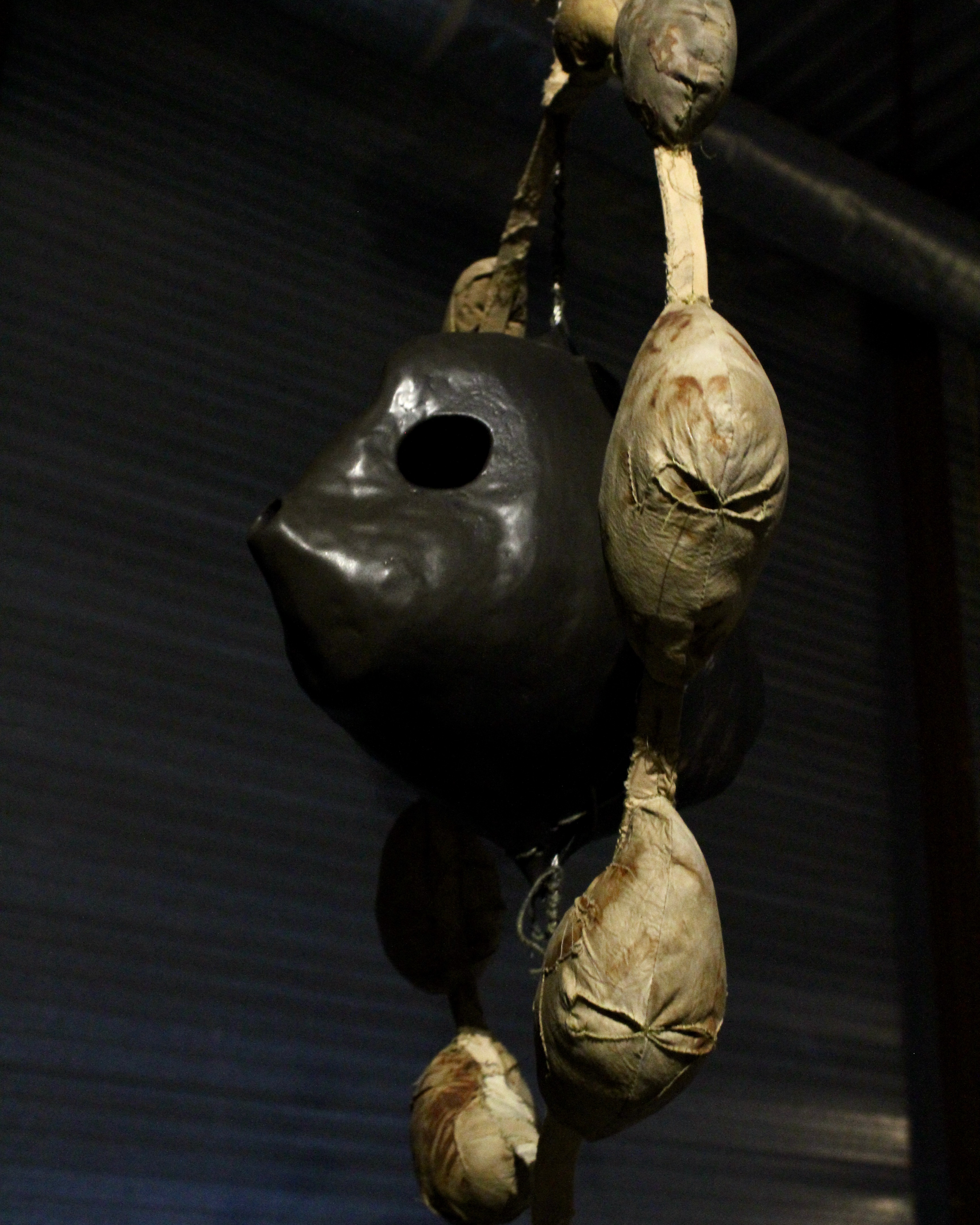 Mixed-media sculpture; natural latex, canvas, ceramics, rope, rust, beetroot, red cabbage, onion peels, henna, clay plaster, straw, found foam, ink.
