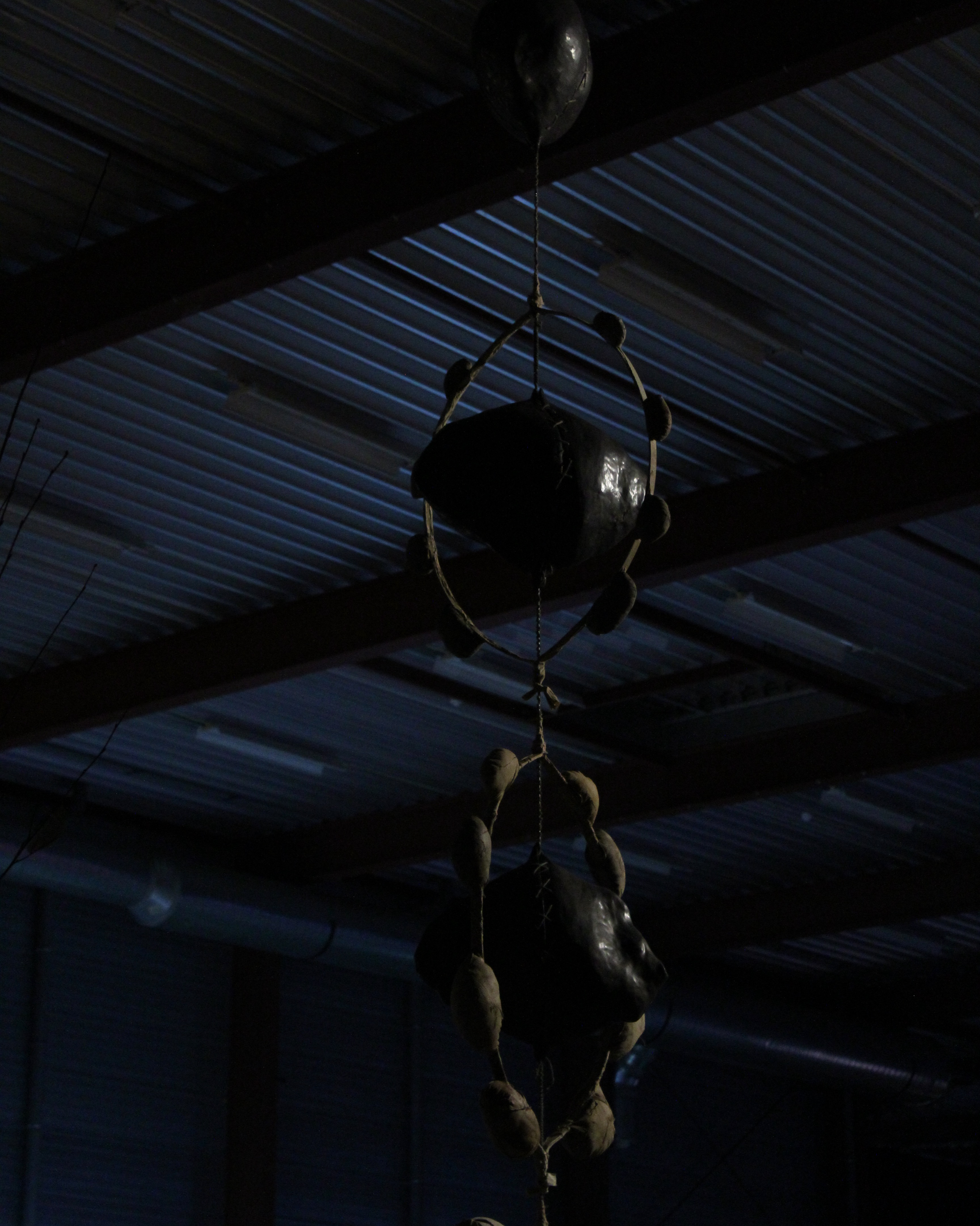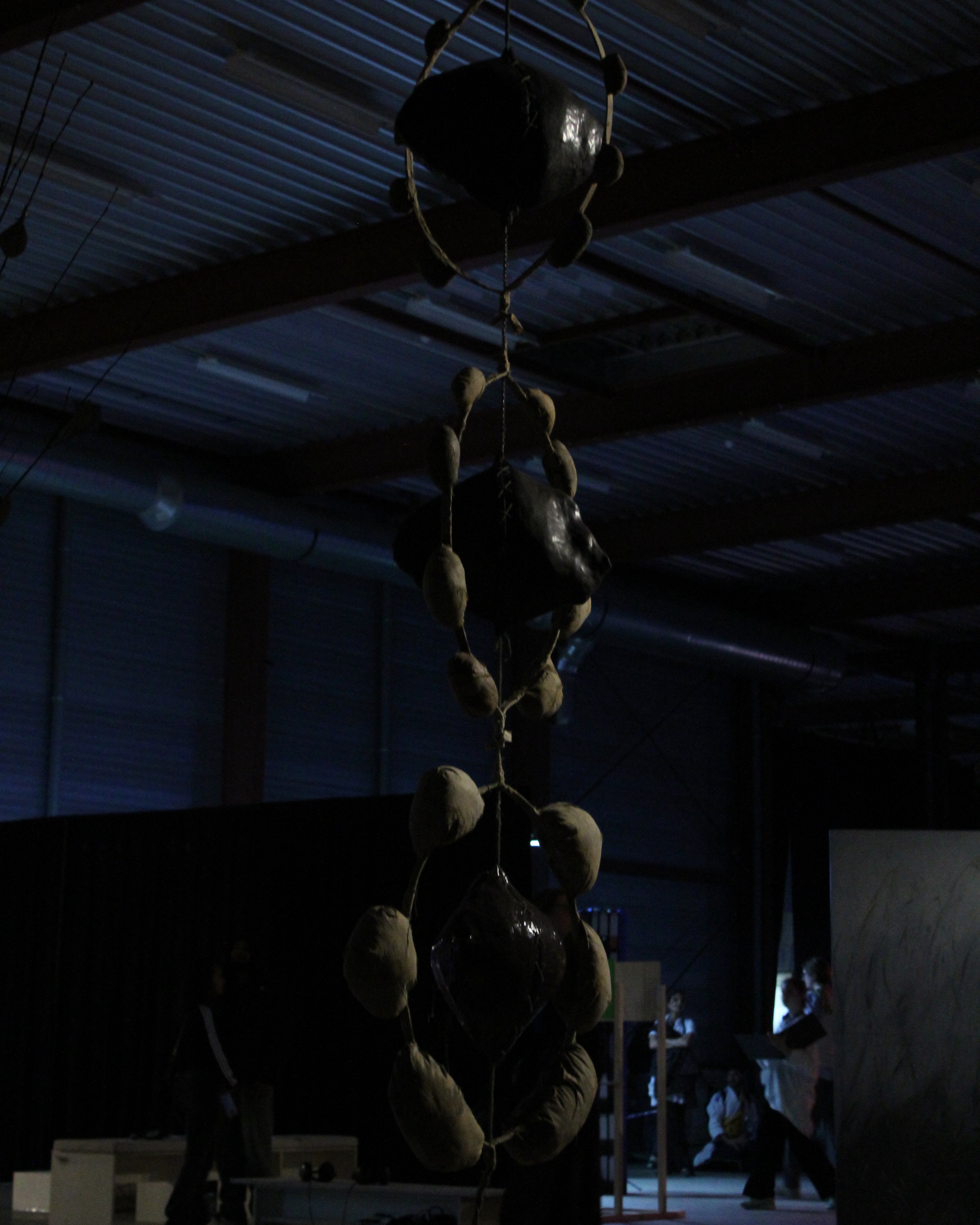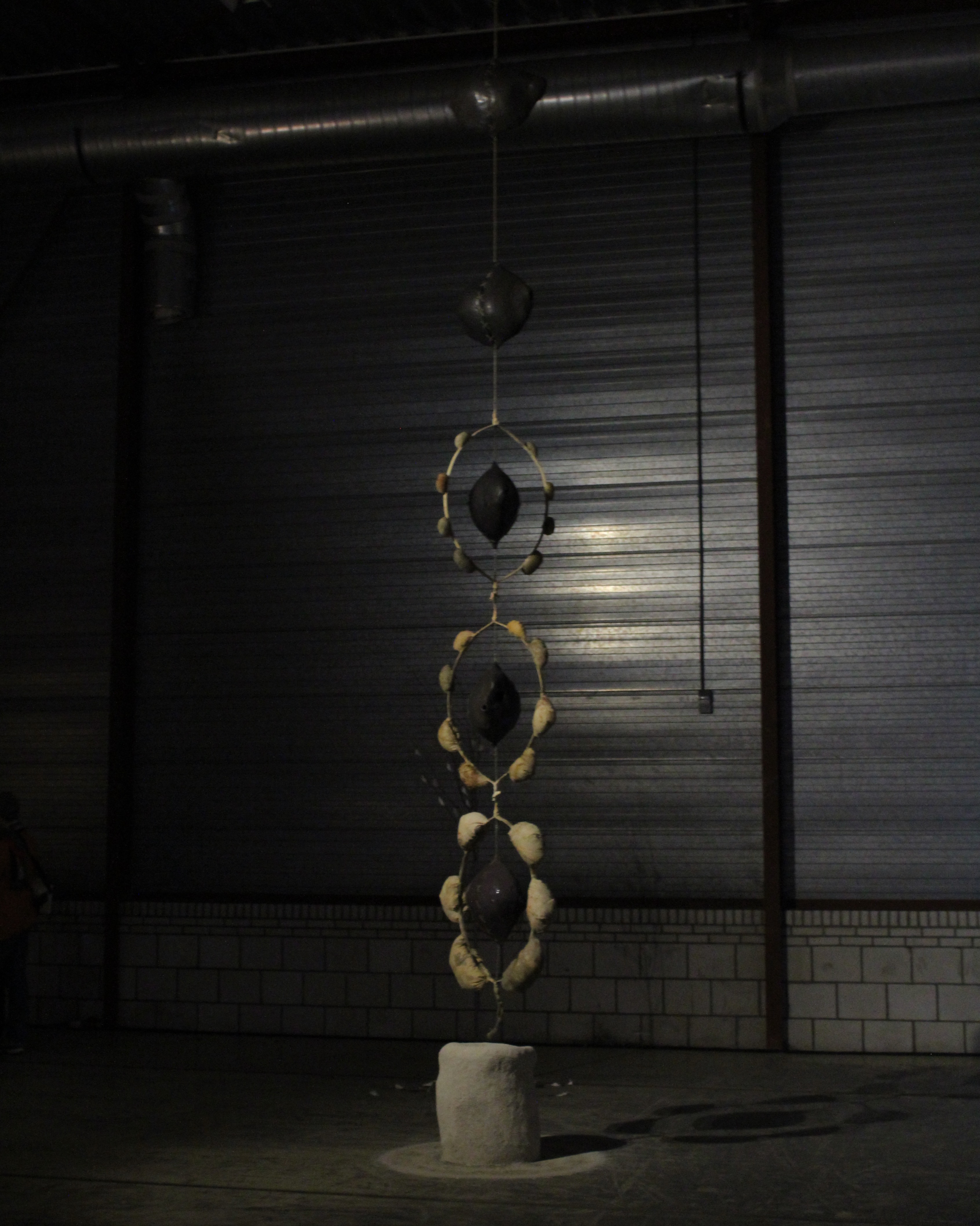 Mixed-media sculpture; natural latex, canvas, ceramics, rope, rust, beetroot, red cabbage, onion peels, henna, clay plaster, straw, found foam, ink.