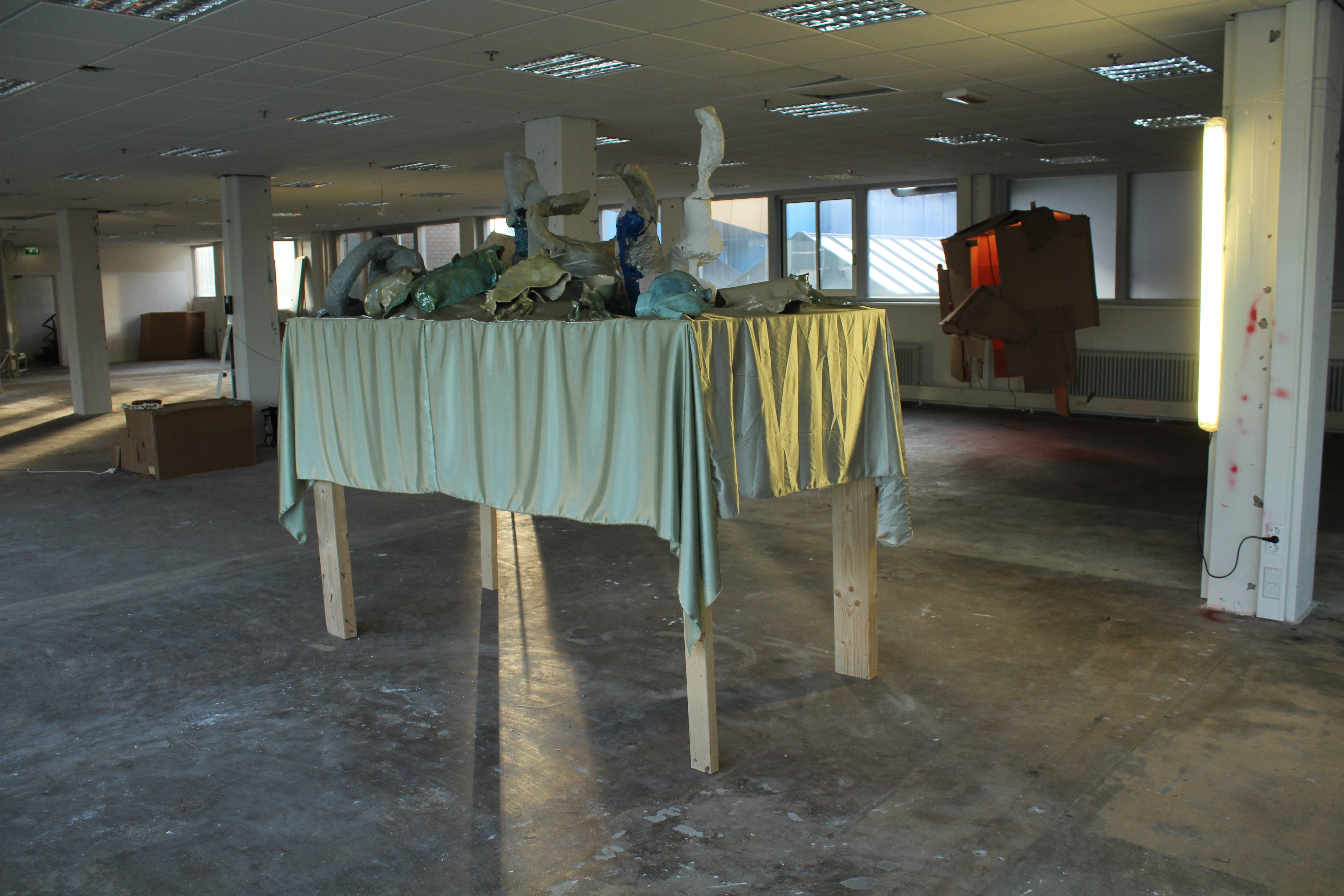 The composition Before, Embrace explores the maladaptive coping mechanism as a form of collective structural disorder - one that attempts to exclude chaos. Placed on an extraordinarily tall table, not for us, in front of us out of reach, lay, crawl, and fold the embodiments of ‘tendencies’ of the mechanism, that is at its core frightened by the unknown.