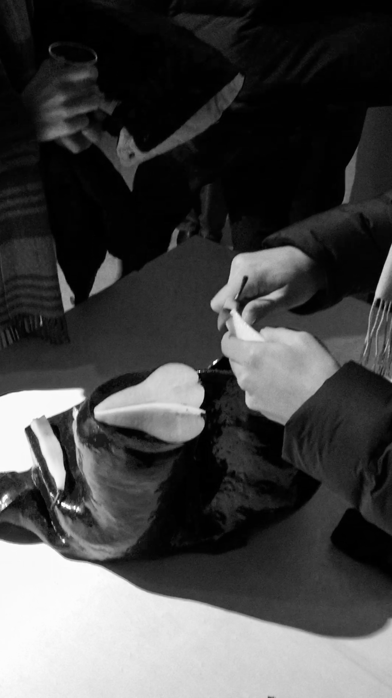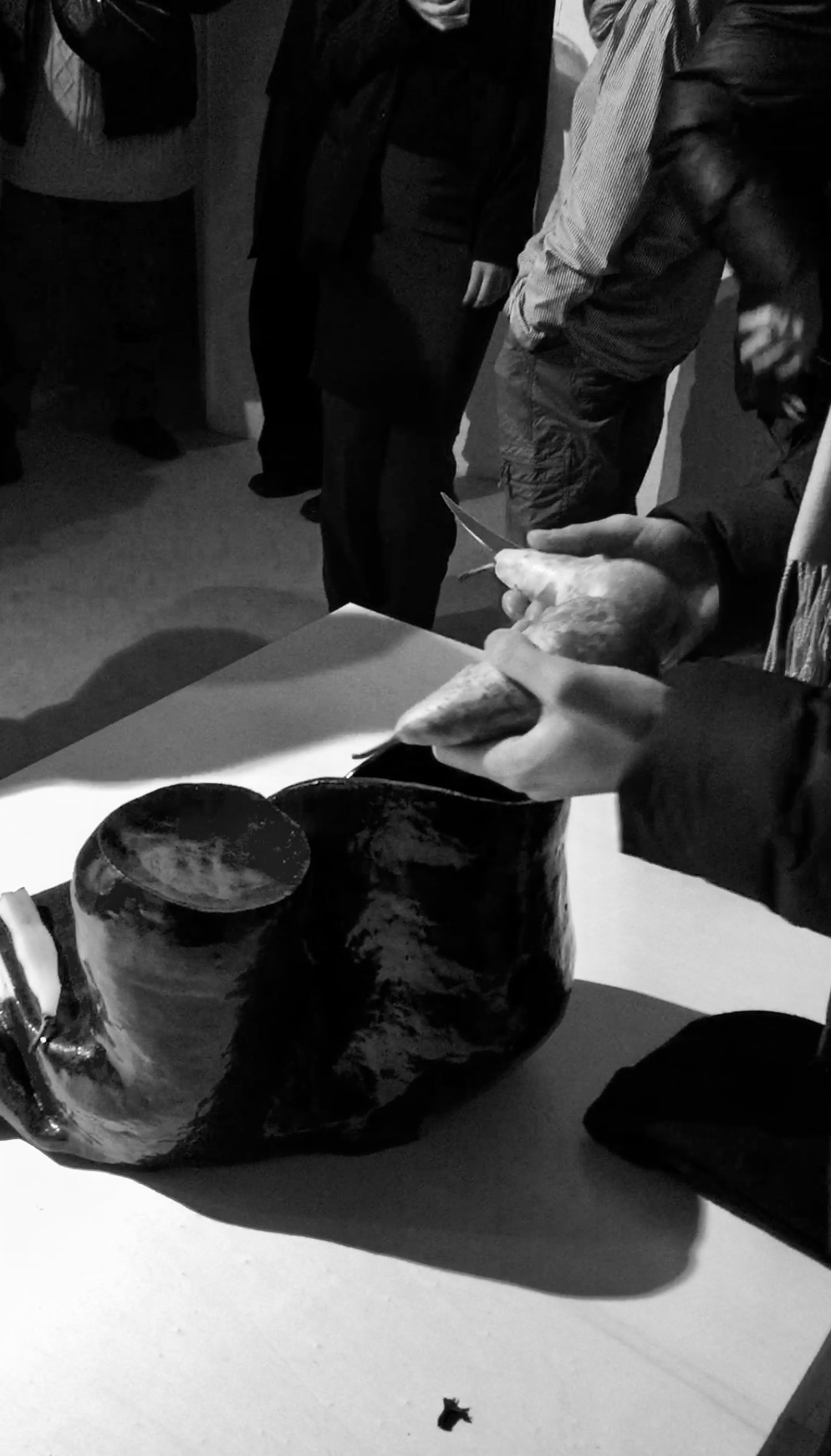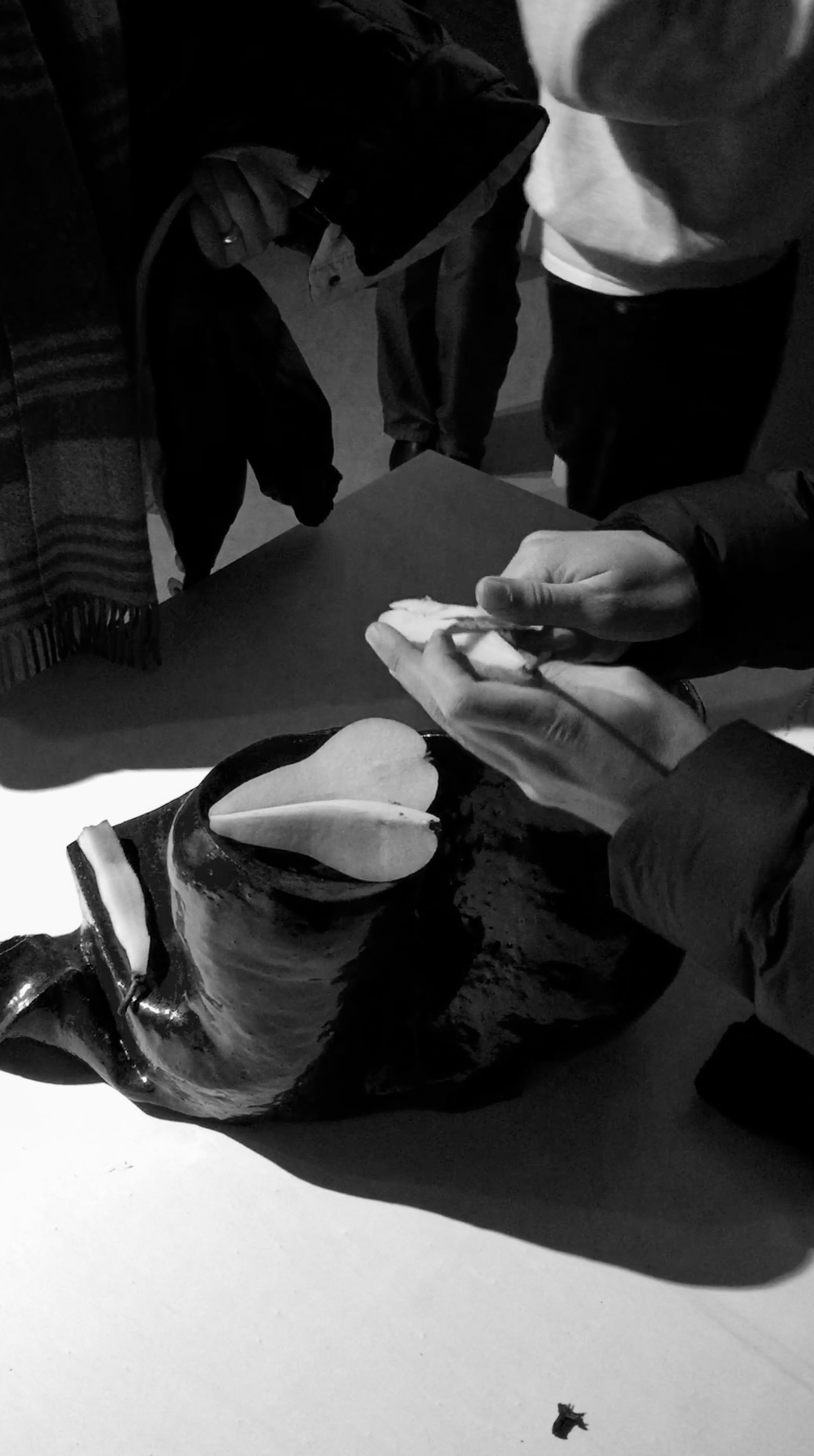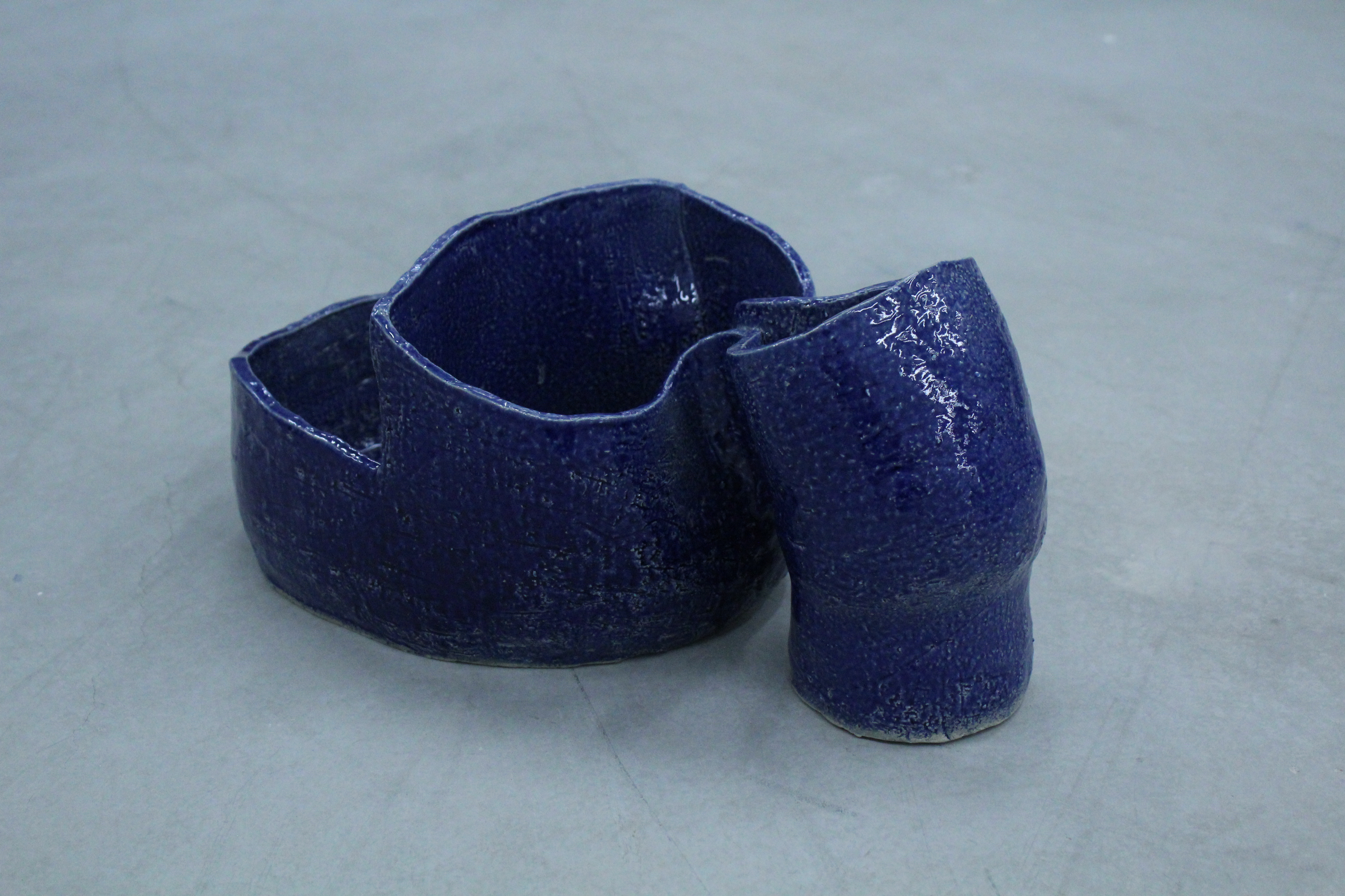 Vessels for Solitude are two fruit bowls glazed blue, the most unnatural color, that provide willingly, and less willingly, fruits to be sliced for ‘Yourself and Someone Else’. During the exhibition, both bowls provide the visitor with ripe, and juicy fruits, a small knife, alongside a small instructive note.