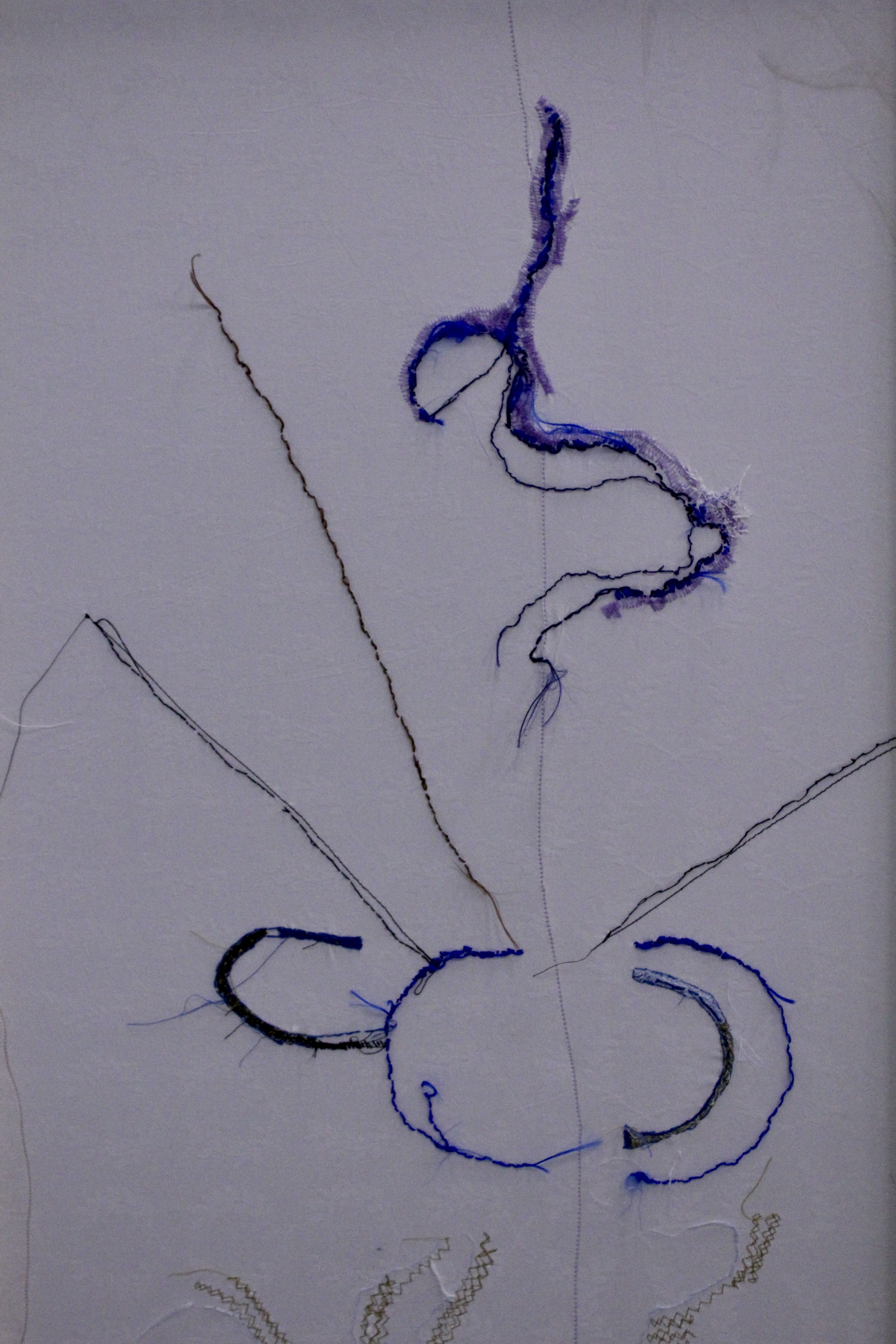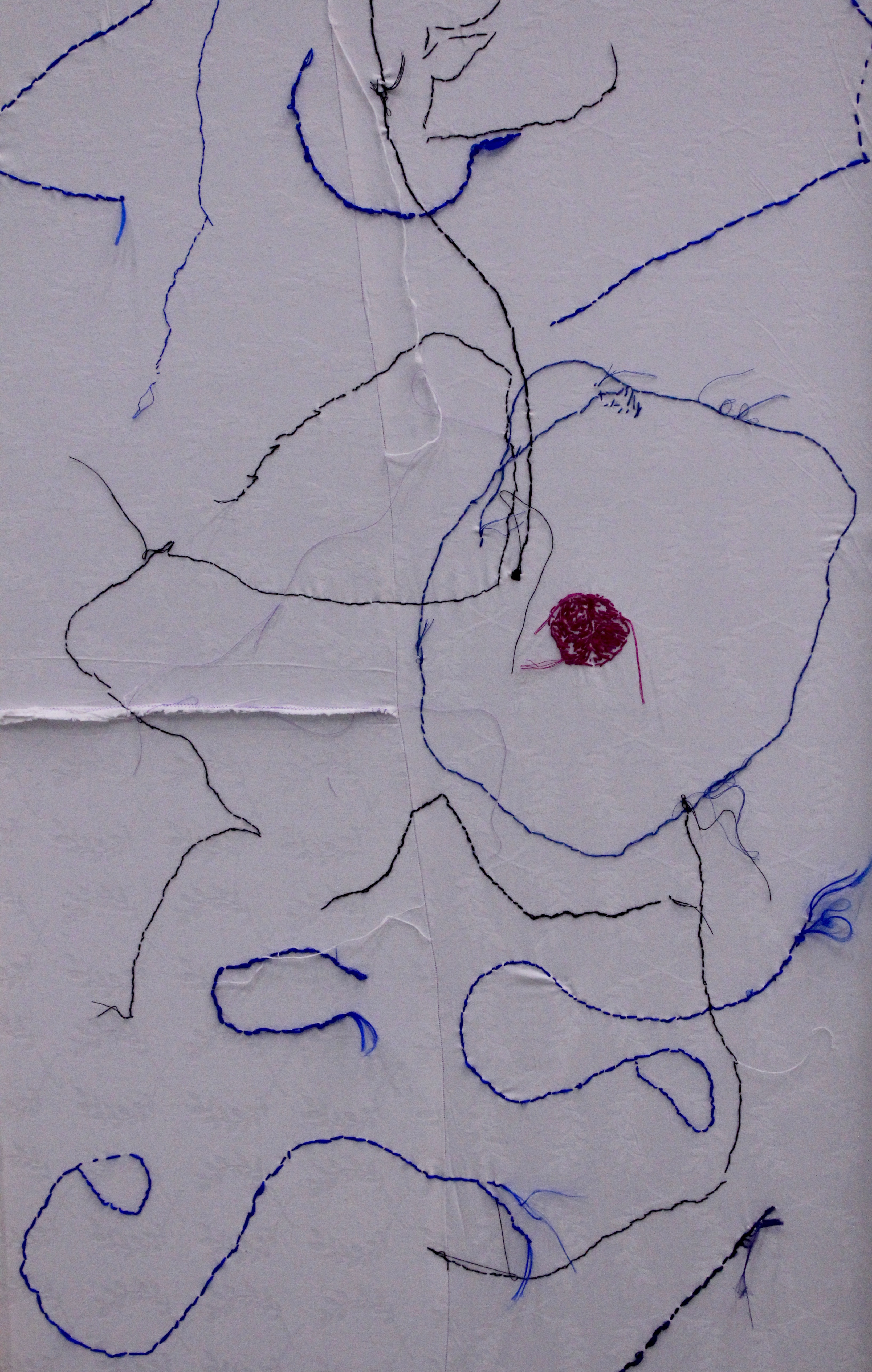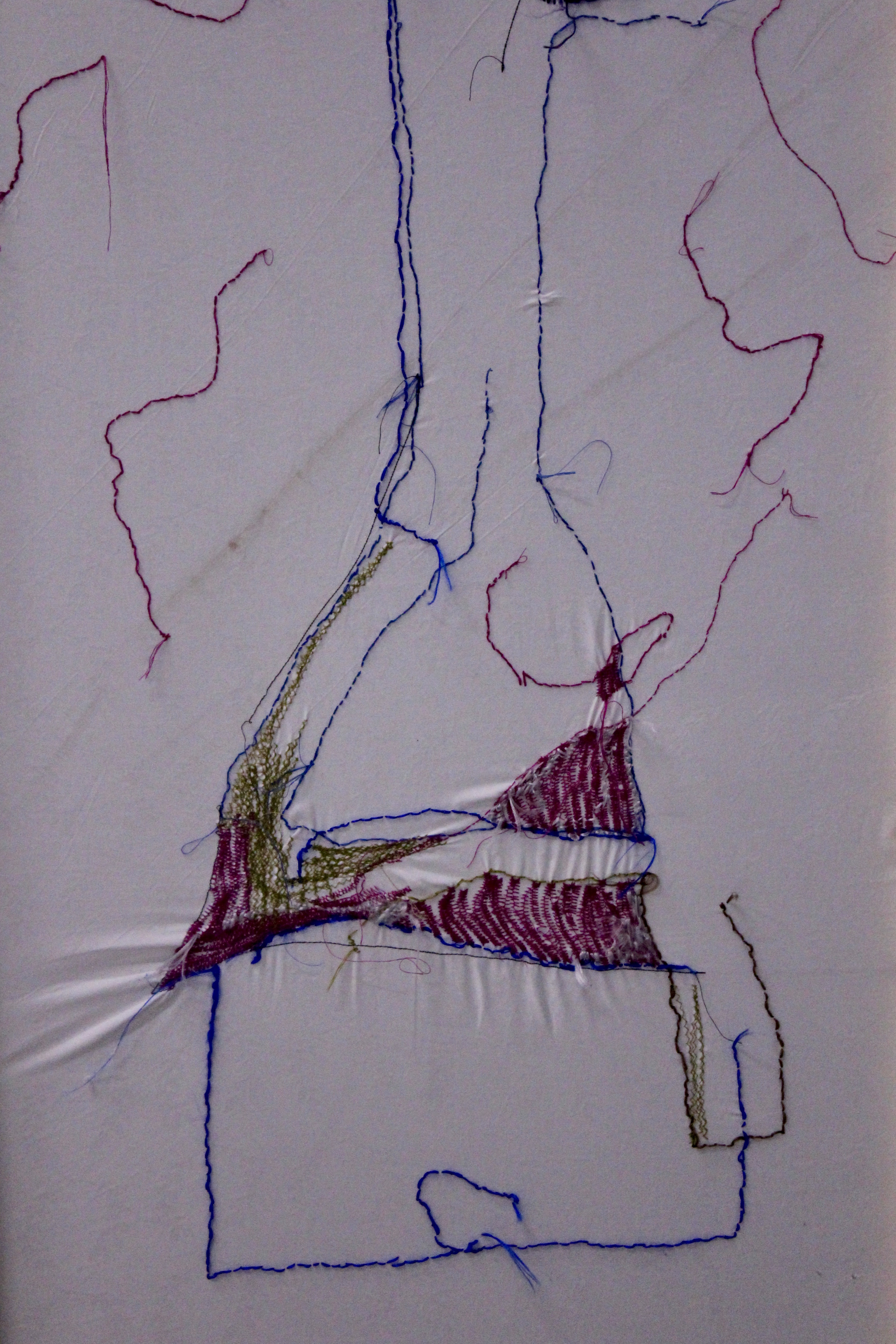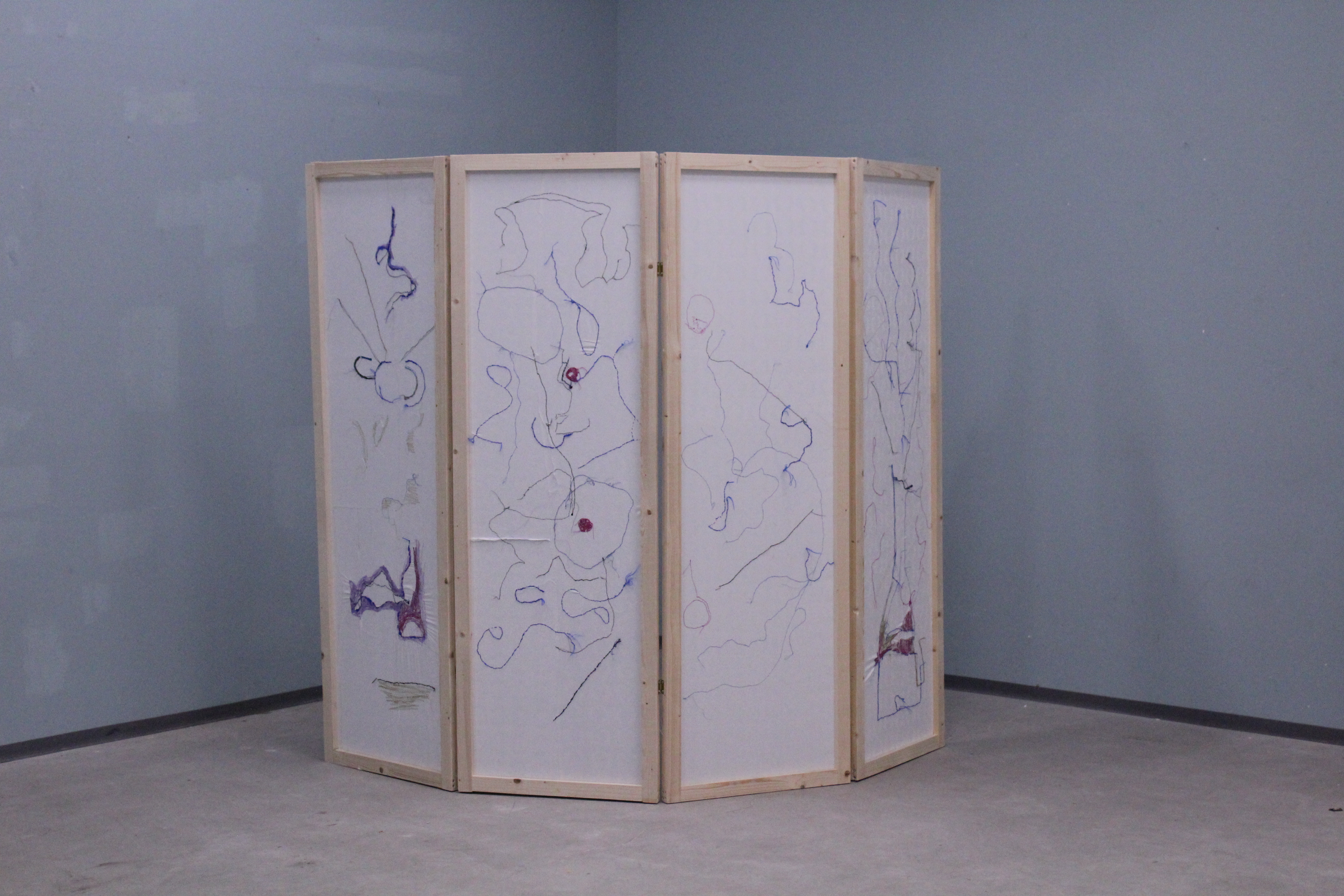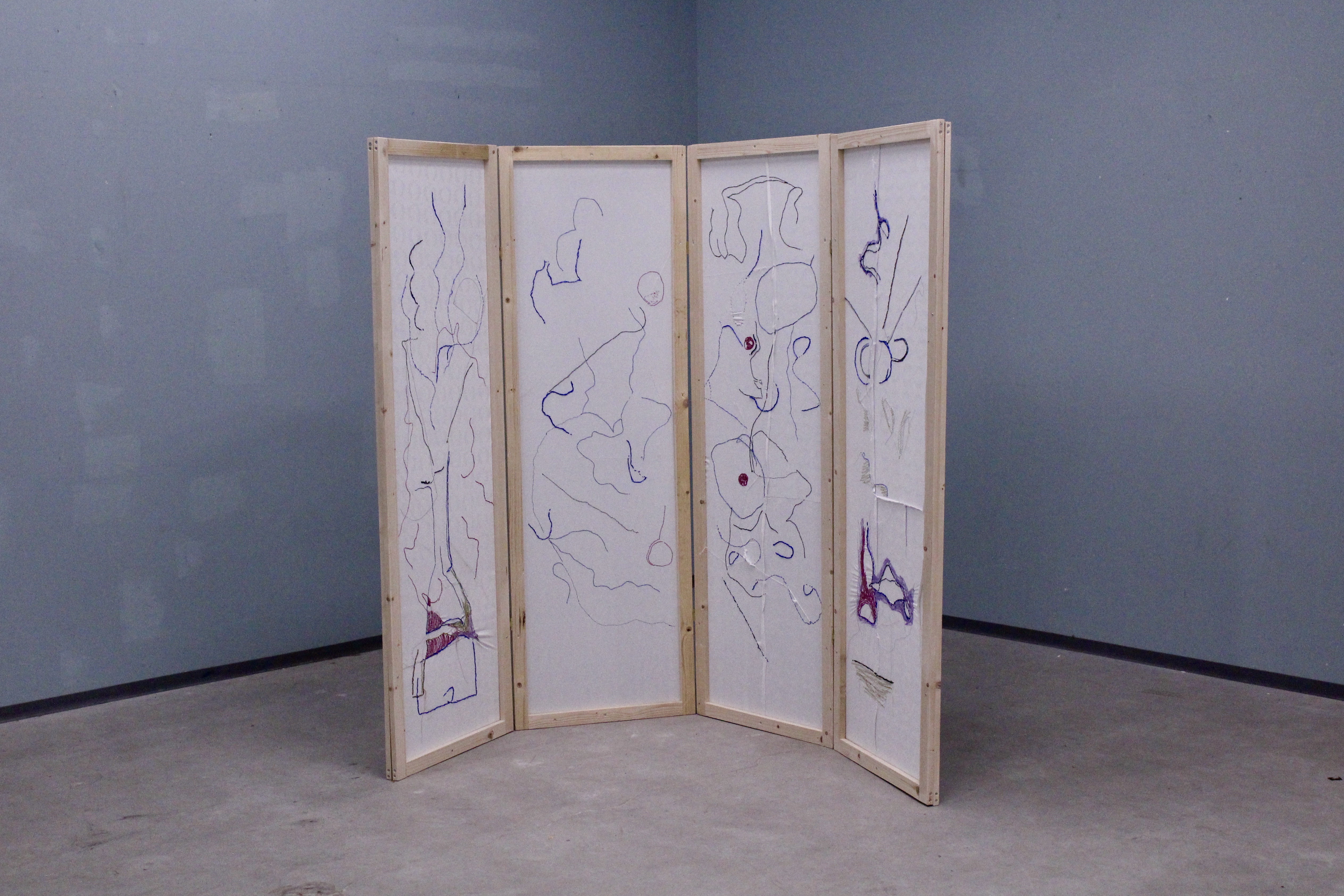 The Border Of Us, is a room divider, made with stretched sheets, that have been embroidered to tell the story that we tell ourselves to remain alone from left to right, and to never be alone again from right to left.