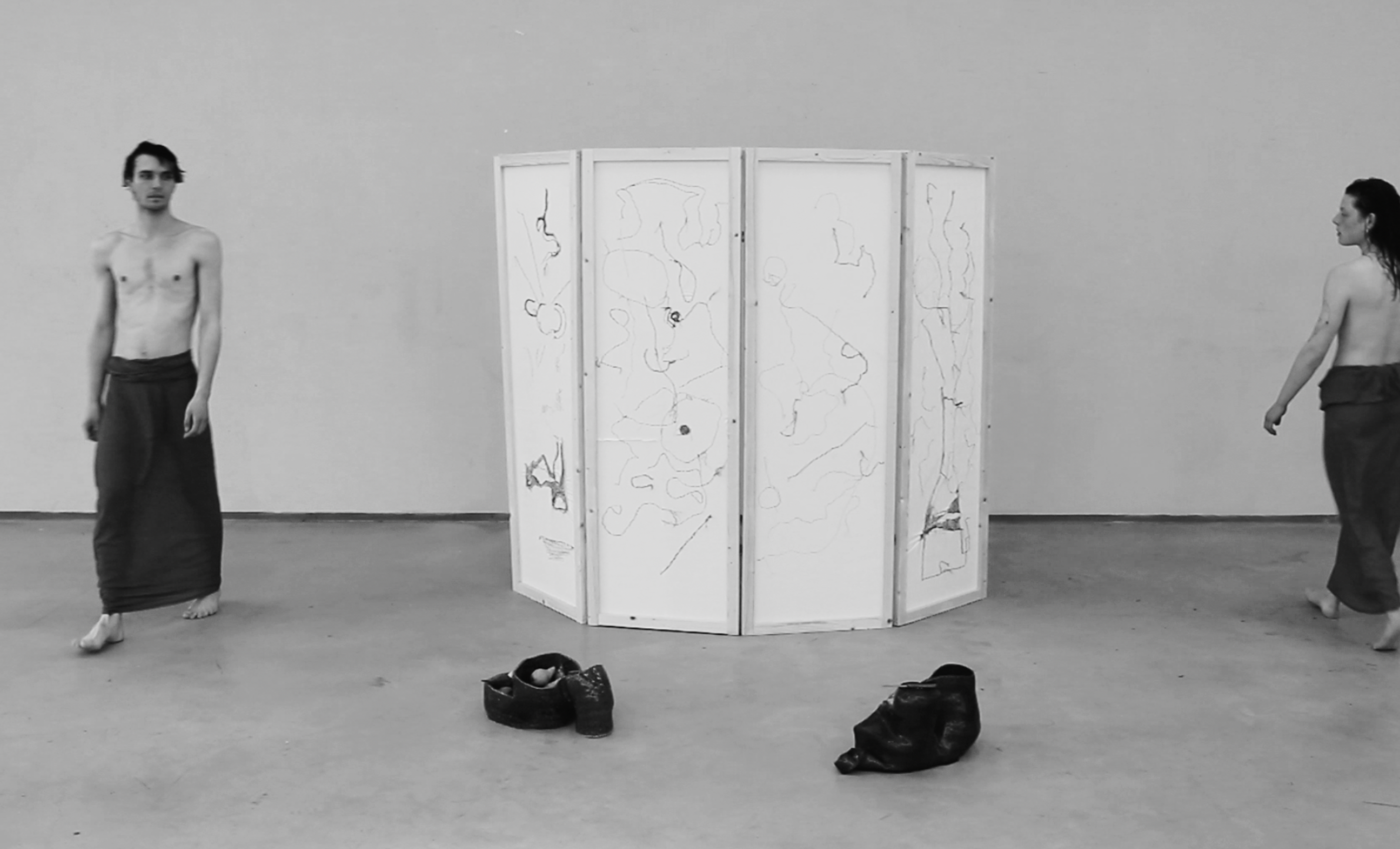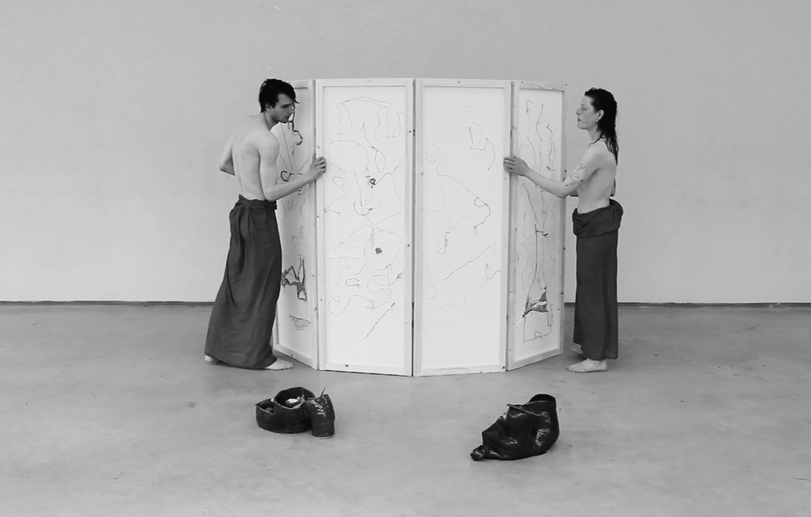 Us exists in this space, without a door, so although you resemble an obstruction at the beginning, ’us’ is always open. We cannot exist elsewhere. In this space, we are, although we are both rather whole than part, together. We are not dissolving or eating each other’s dirt. We just stand with our backs against broken white walls, whilst we try to catch the shifting shapes that the objects create. We talk about the shapes we catch and sometimes when we are moved by the shapes, we pass them on to each other, giving each other an eye.